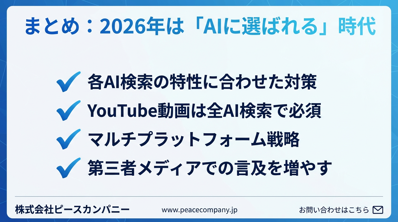 各AI検索の特性に合わせた、複数プラットフォームでの展開が必須です。